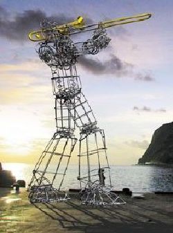 雕塑作品吹长号的机器人跆拳V