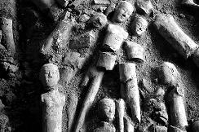 令考古人员最为惊喜的是,在K2出土了大量的裸体陶俑,这些陶俑个个赤身裸体,没有胳膊,身高只有五六十厘米。“陶俑有男有女,当初应该是排列整齐、身穿衣服的陶俑。”考古专家说,陶俑的胳膊是木头的,当时制作好后,工匠们给他们穿好衣服陪葬,后来由于陪葬坑被盗和焚烧,陶俑倒在地上,胳膊、衣服早已腐朽,只剩下了赤身裸体。目前考古人员已提取近300件陶俑。