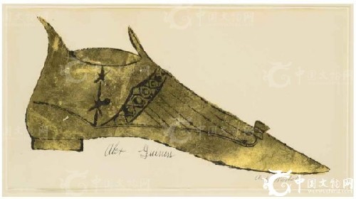 据悉,香港苏富比将于 2013 年 9 月 12 日至 24 日在位于太古广场五楼的香港苏富比画廊举办名为《沃霍尔之爱》的美国波普艺术领袖安迪·沃霍尔作品销售展会。图为沃霍尔于 1956 年至 1957 年创作完成的油墨与金箔贴花作品《鞋》,署有签名和标题,尺寸为 10×19 英寸。图片来源:苏富比。