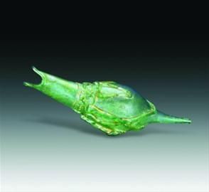 辽博专家介绍,玻璃注是利用吹管的技术制作成型的,成型后在身体上贴粘玻璃条组成细部图案。这件国宝重心在前,只有腹部充水至半时,因后身加重,才得以放稳。如此奇特而罕见的动物造型的早期玻璃器目前全世界仅此一件。