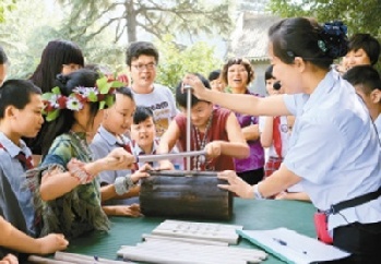 小学生们在“周口店遗址巡展——走进半坡”展厅外体验“北京人”如何钻木取火
