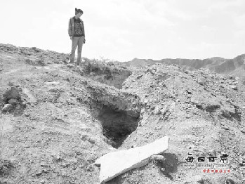 出白银市区沿国道109线向西不到5公里,便到了白银区强湾乡川口村。9月3日中午,记者到村里向村民打听盗墓的地方,村民显得很警觉。记者在表明身份后才打消了村民的疑虑,村民告诉记者,近几天,来到村里打听墓葬的人一拨接一拨,他们也分不清楚哪些是盗墓的哪些是执法部门的人。在村民的带领下,记者来到了盗墓贼“光临”的一处山丘,远远望去,山丘到处有被挖的痕迹。走上山丘,直径一米左右的土坑随处可见,遍布整个山丘。据村民介绍,这些都是盗墓贼挖的盗墓坑,记者注意到有些坑内有人的尸骨,并散落着很多石板。在挖开的坑壁上,也有很多针孔般的窟窿,村民称是盗墓贼使用专门的探测仪器留下的痕迹。一村民告诉记者,他们是村里的老户,根本不知道荒山丘上会有古墓。8月中旬有村民发现山体到处被挖,这才发现有人盗墓。