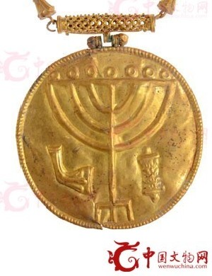 耶路撒冷希伯来大学考古学家埃拉特·玛扎尔博士(Dr. Eilat Mazar)向外界展示在耶路撒冷圣殿山脚下发现的金质奖章。奖章直径约10厘米,上面刻有三样图案—烛台(寺庙用枝状大烛台)、羊角号(公羊的角),以及摩西五经纸卷(狭义专指《旧约全书》前五卷中的律法)。