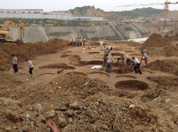 这处遗址位于台柳路一处新建楼盘的施工现场内,8月18日晚,挖掘机在进行夜间作业的时候,挖掘到了一些青铜器、陶器、棺木等物品,部分物品在挖掘时遭到了破坏。随后施工方通知了街道办,街道工作人员紧急通知了李沧区文物管理所。目前,工作人员正在对遗迹进行全面的考古挖掘,已经发现一些汉代、战国时期的文物。不过,此处遗迹具体的年代,以及墓葬主人的身份还有待于专家的论证。图为挖掘现场。