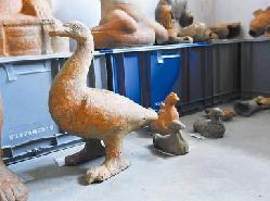 与其他汉墓出土的陶俑不同,此次出土的陶俑体型巨大,如一只陶鸭,与五六斤重的鸭子一般大小。有趣的是,出土的陶俑脚上几乎都穿着草鞋,“这是什么原因还不知道”。相伴而出的还有摇钱树残枝、铜人像、四神铜镜、铜灯等器物。