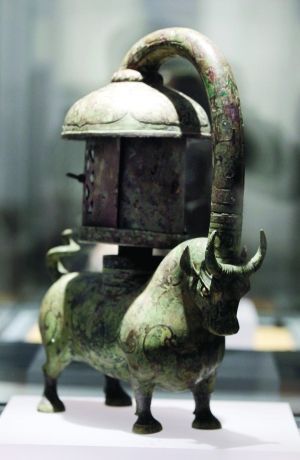 一个展台上,展出了5盏汉代灯具,其中一件错银神兽纹铜牛灯,是南博的镇院之宝。它是广陵王刘荆使用的灯具,之所以成为国宝,不仅是造型精美,更因为其设计精巧,还十分环保。铜牛灯的灯盏安装在铜牛背正中的圆形基座上,有可以转动的灯盘,用来调节光照的角度,灯盏上部,有带菱形镂空装饰的挡风板,挡风板可以活动,可以起到挡风和调节灯光强度的双重作用。灯罩可以360度旋转,顶部伸出一个管道和牛头顶部相连接,形成一条完整的排烟通道。中空的牛腹部可以盛水,点灯产生的烟灰,通过烟道进入牛肚子,溶在水中,从而减少室内污染。