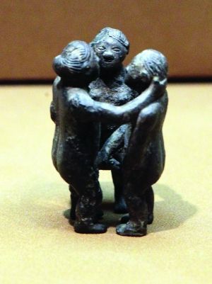 在展厅内,考古专家很神秘地说,“你看,那个!”顺着手指的方向,现代快报记者看到一个非常小的青铜雕塑,细细看去,是3个人,一男两女。他们身上都光溜溜的,其中两个女的手里还拿着什么。“这是汉代的秘戏铜雕,很难见到。”专家说,在汉代墓葬中发现这种“秘戏”文物也不新鲜,当年,考古专家在四川省眉山市彭山县江口镇就发现了汉代崖墓的一幅秘戏浮雕,现存北京国家博物馆,是国家一级文物。