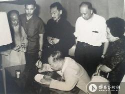 张大千、李顺华、郎静山、高岭梅、张三姑围观福州诗人、书法家题扇。曾履川摄。
