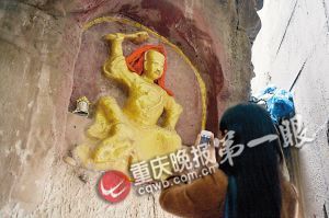 周先生昨日报料称,渝中区黄沙溪竹木街长江边九滨路岩壁上的摩崖造像被人涂成了金色。文物专家称,该摩崖造像可能是明朝时期作品,正在准备申报区级保护文物。