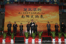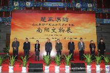 出席开展仪式的有中共北京市委常委、宣传部长李伟,中共河南省委宣传部常务副部长王耀,河南省文化厅党委书记、厅长杨丽萍,中共南阳市委书记穆为民,北京广播电视台党委书记刘志远,北京市文物局局长舒小峰,北京市文物局副局长、首都博物馆党委书记郝东晨,河南省文化厅党组成员、文物局局长陈爱兰,中共南阳市委常委、宣传部长王新会,南阳市人民政府副市长冯晓仙等各级领导。出席开幕仪式的还有:南阳在京人士,首都文博界嘉宾,中央、北京市、河南省以及南阳市新闻媒体的记者朋友们。首都博物馆党委书记郝东晨、中共南阳市委书记穆为民先后为本次展览致辞。