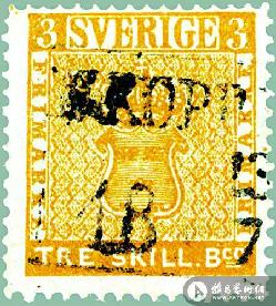 瑞典橘黄色3斯基林邮票,是全球闻名的珍稀错色票之一,至今所知存世仅此一枚;1990年5月,曾经在瑞士菲尔德曼公司付拍,落槌成交价达到189.75万瑞郎(约折合137万美元),一跃成为世界最昂贵的单枚邮票;1996年11月8日再次拍卖,一家瑞典财团出价287.50万瑞郎(约折合237万美元)而成为新票主。直至今日,它一直占据着世界上单枚邮票最高拍卖价榜首。