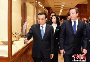国务院总理李克强2日下午陪同来华访问的英国首相卡梅伦参观了国家博物馆。两国总理先后参观了后母戊鼎等青铜器、佛造像以及青花瓷器等藏品,并与两国大学生亲切交谈。