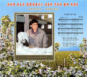据报道,邮票上写有“伟大领导者金正日同志永远和我们在一起”、“主体100(2011)-主体102(2013)”字样,两款邮票中分别印有金正日指导朝鲜人民军军人火炮射击训练、以及视察二·八维纶联合企业时的图片。