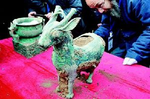 昨日的提取工作依旧从上午9时开始,提取的青铜器主要还是簋(gui)、鼎、甗(yan)、簠(fu)盘、礨(lei)等,到15时20分许,四耳入钉簋才被提取出来。正当人们为这座西周青铜器中出类拔萃的精品拍手叫好时,令人更为激动地时刻又到来了,本次发掘中最具艺术价值的牺尊出现在大家眼前。