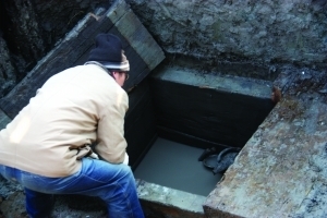 工作人员找来工具将4块盖在上面的木板一块块移走,发现木箱柜内有浑浊的水,工作人员忙找到水桶,将里面的水往外提,大约提了20桶水以后,箱柜底部渐渐露出数件文物,工作人员穿着雨披下到箱柜内,小心翼翼将箱底水里的文物一件件取了出来。记者在上面看到,被取出的文物有碗、罐,还有沾着淤泥的其他工艺品、金属物体等,取出约10件后,工作人员接到一个电话,便停止了取物,还让人弄来几桶水重新倾倒到箱柜内,将水箱里文物重新覆盖。
