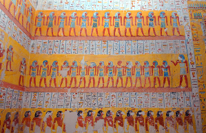 据了解,拉美西斯三世退位后,拉美西斯四世于公元前1156年继承王位,但仅在位6年。由于当时正值经济衰弱,因此与帝王谷中其他法老的墓穴相比,拉美西斯四世的墓穴装饰相对简单朴素。从照片中可以看出,壁画图案以描绘古埃及神灵传说和当代日常生活为主,多运用动物形象和象形文字向人们诉说展示。