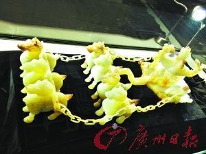 汉代玉马车、玉编钟、玉璧……在坂田手造文化街的大山回响书画院展厅里,记者看到多件巧夺天工的古玉作品。汉代的“玉马车”是非常受欢迎的题材,有多种不同的作品展出。例如其中一件是一名身穿汉服的男子,驾一匹健硕的骏马,身后的马车呈镂空雕花,并有蘑菇状的华盖顶棚。而另一件则有前三后四共七匹骏马拉着一辆装饰华丽的雕花翘檐马车,玉石通体透亮,栩栩如生。此外,还有七八个悬挂在钟架上的玉编钟,以及各种人物玉石作品,形态逼真。