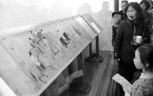 宋徽宗赵佶摹张萱《虢国夫人游春图》近日在辽宁省博物馆展出。该画再现了唐玄宗宠妃杨玉环的三姐虢国夫人及其眷从盛装出游的情景。《虢国夫人游春图》是现藏于辽宁省博物馆的国宝级珍品,是以绘画形式保留下来的对虢国夫人生活的珍贵记载。图为2月25日,观众在欣赏宋徽宗赵佶摹张萱《虢国夫人游春图》。