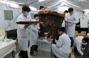 在内蒙古自治区锡林郭勒草原出土的、距今1500年前北魏时期中国古代北方民族贵族漆棺,8日在锡林浩特市开棺,目前墓主人身份、性别还未确定。