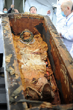 据文物专家初步认定:此棺的时代为距今1500年前的北魏时期,但具体属于哪一民族还待最后确认。墓葬内除了一具漆棺,还发现陶罐4件、铁灯3件、青铜龙首仪仗钩8件。