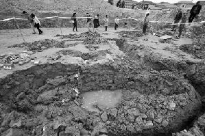 记者走下去,发现墓地四周的泥土十分松软,一脚踩下去就有往下陷的趋势。据记者观察,古墓占地面积在20平方米左右,四周被挖出一道数十厘米深的沟。在古墓旁边,散落着不少挖出来的青砖块,大小和现在的砖块相近。记者注意到,在古墓的东侧,有一个用木板遮盖着的洞口,洞口直径在1米左右。掀开木板,记者看到地洞里面有很多积水。“积水很多,都还没往外抽呢。”有工人告诉记者,上午有警察来过,在古墓周围拉起了警戒线。