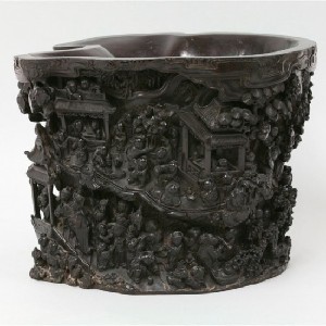 这个木筒高24厘米,产于公元18到19世纪清朝乾隆年间,用一整块紫檀木雕刻而成,应是用来放置毛笔的笔筒。笔筒外面雕有百子图,雕工十分精细,皇室家庭专用。