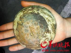 随后,专家走访当地居民时,一位妇女用来盛水喂鸡的古陶引起专家的注意,专家发现该古陶为陶罐的盖子,上面有文字,初步判断为周朝陶器。当地一位村民去年建房时开挖出两缸古钱,重约200斤,这次勘察时拿出一串鉴定,发现均为唐宋时期古钱。