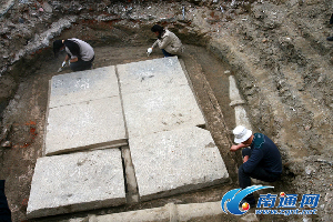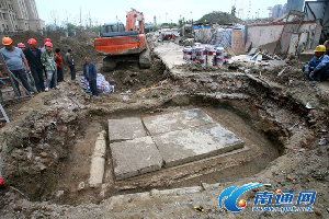 该墓葬位于市区北城大桥东侧、通吕运河南岸的五洲国际广场工地,9日下午1时许在施工过程中被发现。市文广新局文物处处长杜嘉乐介绍,当天下午接到报告后,我市文保部门迅速启动应急保护措施,对被挖掘机掀动的墓室顶层东南角石质盖板进行复位和盖土回填,同时将情况向省文物局报告。 11日,我市成立了由省考古研究所专家杭涛领衔、南通博物苑文物保护部专家共同参与的联合考古队,开始对墓葬外围进行清理和勘探。