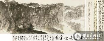 此巨幅山水作品《西陵峡烟云图》是傅抱石1960年“二万三千里写生”的重要成果之一。这幅作品也确为傅抱石创作历史中一件重量级的巨幅佳构。西陵峡素以“滩多水急、险要雄壮”闻名于世。在这幅作品中,傅抱石没有具体去描绘西陵峡的细微的险绝地点,而是以飞动泼辣的“抱石皴法”作“大块文章”,气势雄阔、奔放自由。大笔触着墨,更是要表现西陵峡的大气磅礴;难得的是,傅抱石将细微处的着力点放在了长江中行驶的轮船和岸边隐约可见的建筑。这一“大”一“小”的对比,更增加了西陵峡“雄壮险要”的气势。