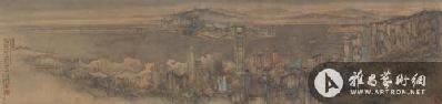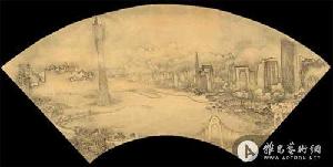 小巧扇面上展现气派山河,水天中央,浮云飘飘。在这大气盎然间,建筑物逐渐显形,但它们看起来还不完整,像是仍处建设阶段。徐健国曾说:『山河为自己而存在,不去理会世间烦嚣』。他展现的是否就是这种与世无争的都市风景呢?其许多画幅采用俯瞰视角,而非一般路人角度。所画之景离观者很远,而且一般没有任何人物,就像众神与天使望向凡间的目光。