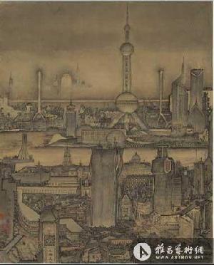 上海的建筑语汇与香港有所不同,至少在浦东以及部分外滩的建筑中,球形被看作是典型形态。《浦江新异图》构图紧凑,按透视法缩短,强调各种形状的强烈对比与相互影响。在描绘上海复杂的建筑语汇之外,还在前景中生动展现了旧上海的城市构造,描画出旧城与新城间的层层矛盾。图中表现出强烈的色彩对比,构图更令时间及空间愈发紧凑,因而充满冲击力。