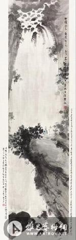 “抱石画水,如闻其声。”这是对傅抱石画水技艺的高度赞誉,也表明他画的水具有很强的动感。的确,他的很多作品都由於他创造性地用“皴水法”画水,而取得神妙的艺术效果。该作构图奇特,在画幅右上角和左下角设置了两组瀑布群,中间突兀的一块巨石既连接了两组瀑布,又隐含了两组瀑布上下水流间的关系,而巨石上的点景小从不仅反衬了瀑布的宏大气势,而且作为“画眼”,营造了浓浓的诗意,所谓“如闻其声”,也从他们的手势和神态上转射出来。傅抱石的“皴水法”实是从山石皴法中移植而来,用淡墨散锋“扫”出流泉瀑布湍急奔涌的水势,以重墨点画水口中裸露的巨石,它和传统的“勾水法”相较,更富有真实感。