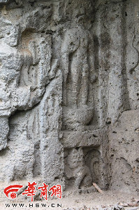这处窟龛雕像群位于岐山县蔡家坡镇的一座石山上,共有大小5个窟龛,窟内雕刻的人像肉髻高,造型修长,秀骨清瘦、裹衣缚带。昨日,宝鸡市文物旅游局文物保护中心主任龙剑辉说,初步断定,这处窟龛雕像群为1600多年前的北魏时期所建。龙剑辉说,虽然窟龛中的石雕风化比较厉害,但个别窟龛里还能看到雕刻精美、栩栩如生的人物、动物造型的雕像。其中一处石窟中,还有一只类似“招财猫”造型的猫型石雕——这只猫不仅有凹凸有致的眼睛、胖胖的身体和翘起的长长尾巴,而且还呈现蹲坐姿态,一只前爪放在地上,另一只爪子似乎在向人招手。“说明那时日常生活中就已经有猫存在了。”龙剑辉说,窟是洞穴,龛是供奉佛像、神位等的小阁子,但北魏时期佛像窟龛造像在关中地区很少见,这处发现对研究当时的宗教文化具有重要的文物价值。