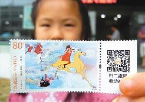 日前,中国邮政发行首套加载增强现实技术邮票《动画——〈大闹天宫〉》特种邮票,该邮票1套6枚。图为可扫描二维码的《官封弼马温》邮票。