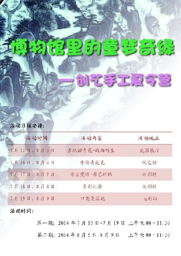 活动特色:此次手工夏令营将以参与体验、生动有趣、分享快乐为特点,让每个孩子都有机会充分表现自己,发挥他们的想象力和创造力,在博物馆里玩转青花瓷,做一个时尚创艺达人。