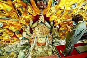 6月28日,在重庆大足宝顶山千手观音造像抢救性保护工程现场,工作人员为千手观音造像贴金箔(见图)。近日,大足石刻研究院的文物工作者和大足日报社记者组成考察采访团,探寻千手观音妆金之谜。