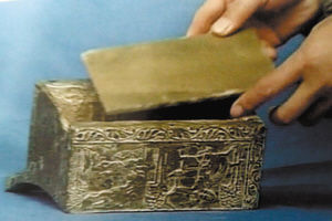 这块极为罕见的玉石舍利函长22厘米,宽19厘米,高9厘米,由一整块玉石凿刻、打磨而成。其上面有一个凹面,如同古代玉石枕头,凹面下面又有一个囊匣,并且还有一个盖子。囊匣正面刻有一幅图,一个人骑着一匹马,脸朝后拉开一张弓,射击从丛林里跑出的野猪。