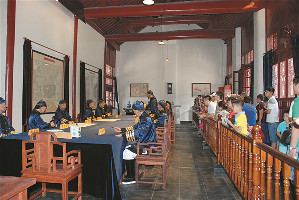 当日上午9时许,新开放的北洋海军提督署内游人如织。三进院落16个厅室的大门敞开,重新陈列后的每个厅室都让人耳目一新。“威震海疆”的牌匾悬挂在一进院中厅礼仪厅的门上,厅中仿清风格的雕花屏风前,正中安放着一只太师椅,两边摆放着桌椅和茶几。“肃静”“回避”牌安立两旁,庄重肃穆感油然而生。走进二进院,中厅议事厅里,丁汝昌、刘步蟾等北洋海军将领围坐一桌,商讨大事。硅胶做的塑像,毫发毕现,12名将领表情各不相同,让人如临其境。参观的游客们也悄声说话,仿佛怕惊扰了这场“讨论”。来自上海的游客程凤英,每个厅室都看得格外仔细。“我以前对这段历史并不了解,参观之后,很直观地了解了北洋海军当时衙门的样子。”程凤英说。