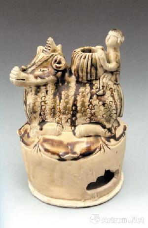 青釉褐绿彩独角兽烛台。(高22cm、口径3cm、底径14cm)
