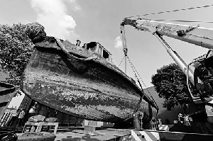 8月3日,在侵华日军南京大屠杀遇难同胞纪念馆,一辆吊车在对炮艇进行吊装卸载。当日上午8时起,历经1个多小时吊装、6个多小时运输,重达32.8吨的侵华日军河用炮艇运抵侵华日军南京大屠杀遇难同胞纪念馆,并举行捐赠仪式。据悉,该炮艇不仅成为馆藏最大最重文物,也将是纪念馆新馆征集到的首件文物。
