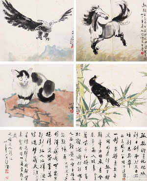 据悉,徐悲鸿此件《书画合册七开选五)》创作于1943和1944年,是年徐悲鸿来到贵阳再到重庆磬溪中国美术学院小住,他的好友,金陵大学的教授传南棣携册向徐悲鸿请画,遂成此册。上款中“述伦仁嫂”即为传南棣的夫人。此册中集鹰、八哥、马、猫、竹及书法为一册,可以说此册展 了徐悲鸿在国画创新方面的成就。徐悲鸿动物画最突出的特点是造型准确,形象真实又笔墨生动。“鹰击长空”的气势凶猛、“翠竹八哥”的自然天成,“奔马”的气魄沉雄等,都是他的成熟之作,特别是这件册页中的翠竹更是徐悲鸿的竹之精品。以往徐悲鸿画竹多用水墨写意于法出之,而这件册页中的翠竹则是用工笔写出,且墨色变化丰富、自然,笔力精到,充分体现出他深厚的国画传统功底。