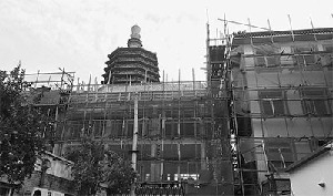 位于北京市西城区广安门外拥有900多年历史的天宁寺,是全国重点文物保护单位,本应得到最严格的保护,但其管理机构却擅自在寺内加盖大面积违规建筑。近日,北京市文物局监察执法部门对正在施工的违规建筑现场执法,勒令其停工。