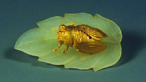 从苏州五峰山博士坞的明代弘治年间进士张安晚家族墓地发掘的“金蝉玉叶”发簪。(南京博物院藏)