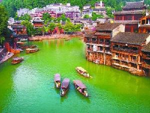 7月27日,游客们在沱江泛舟,欣赏两岸风光。趁着连日来的晴朗天气,大批工匠云集在湖南凤凰古城修复洪灾中受损的吊脚楼建筑群。受“7·15”历史罕见洪灾影响,凤凰古城风景名胜区公共设施和商业店铺部分受损。自26日起,凤凰古城风景名胜区实施灾后过渡期开放。据凤凰县旅游局统计,7月26日至27日,全县共接待国内外游客5.27万人次,实现旅游收入4400万元。