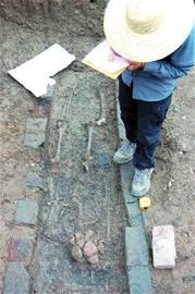 昨天下午,随着保护发掘工作的逐步深入,考古人员发现这处墓葬遭到不同程度的破坏,不少个头很大的古砖被凌乱摆放着。在接下来的清理中,让考古人员兴奋的是,一具古尸很快出现在墓葬中。记者看到,清理出来的这处墓葬长约两米,宽约1米,古尸摆放位置呈东西向,头部向西,双腿向东,头部有被土层明显压裂的痕迹,口部仍还留有两颗完整的牙齿,古尸大腿骨和小腿骨则保存非常完整。经过测量,古尸长约1.65米,初步推断这名先人身高在1.7米以上,至于性别,还有待进一步鉴定。昨天下午,在发现这处古尸墓葬西侧不远处,考古人员又发现了一处清代墓葬。