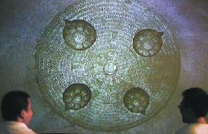 在北京科研院计算中心,观众在明永乐大钟钟体内壁铭文的高清互动图像前驻足观看。该计算中心通过三维技术成功对永乐大钟进行高清扫描,使大钟铭文得以重现。
