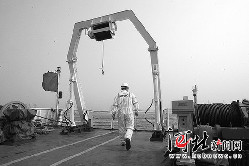 潜水作业不是考古船下去潜水,而是潜水员潜水作业。“两个潜水舷梯放下去,潜水人员通过舷梯就可以进入水里。”“中国考古01号”大副卢文龙说,虽然“中国考古01号”是水下考古船,但是它并不会潜入水下考古,而是主要停留在考古地所在的水域水面进行工作。“这是A字形门吊,用于打捞在海底发现的沉重物品,最重可以吊起30吨的物品。”卢文龙指着甲板后侧的A字形门吊说,根据吊绳的长度,打捞的深度可以达到30米左右。