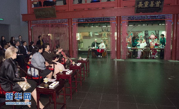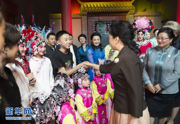 彭丽媛和来宾们一起观看展现中国传统文化和北京风情的《古都风韵》,欣赏孩子们表演京剧《卖水》选段。新华社记者 黄敬文 摄