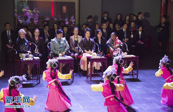 彭丽媛和来宾们一起观看展现中国传统文化和北京风情的《古都风韵》,在悠扬的古乐声中欣赏优雅的花道表演。新华社记者 黄敬文 摄