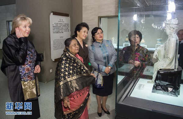 彭丽媛和来宾们一起参观古代瓷器艺术精品展,欣赏元代青白瓷水月观音菩萨像。新华社记者 黄敬文 摄